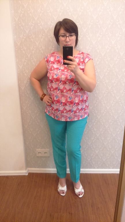 Мне все нравится очень. Кроме блузки первой. Брючки отличные бирюзовые. Может к ним рубашкуили туничку другую? А так отлично все село.
