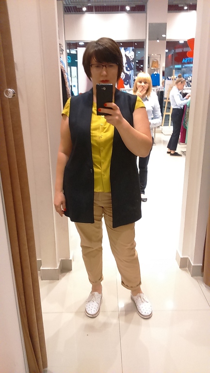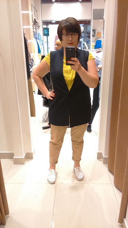 Можно одеть те голубые брюки и белую футболку и ехать подбирать к ним.. меня смущает жёлто-голубое сочетание такой насыщенности. А Жилет, возможно не с таким чётким цветовым контрастом в одежде( именно эта длина в идеале с каблуком и прямыми брюками, может пояском и сумкой "книжкой"), так чтобы не сливался, еще я бы не стала стараться спрятать линию талии, в блузке она подчёркнута, очень приятный силуэт ( но сама модель от 40 до 60 ).. может поискать модель с видимыми деталями? А жёлтый если хочется, то с декольте, чуть дальше от лица )