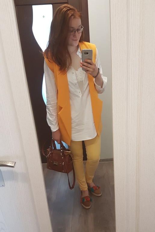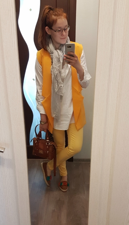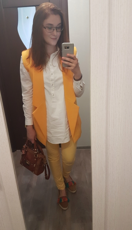 Еще вчера решила жилет этот надеть, правда с джинсами, а утром на глаза попались жёлтые брюки и думаю ну какие джинсы? )))