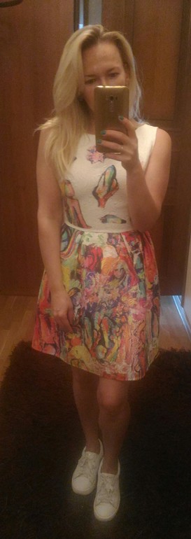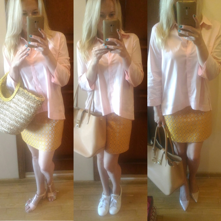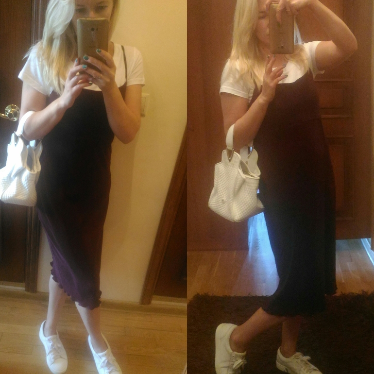 Розовая блузка хорошо с кроссовками, да и с босоножками неплохо, но лучше тогда закатать рукава, а то верх слишком закрытым смотрится. Платье я бы перешила, юбка классная получится, яркая. Платье на футболку отлично. Я пробовала с коротким платьем, не понравилось, слишком по-детски, а у вас длина хорошая. Последний образ не очень понравился, какой-то бледный совсем.