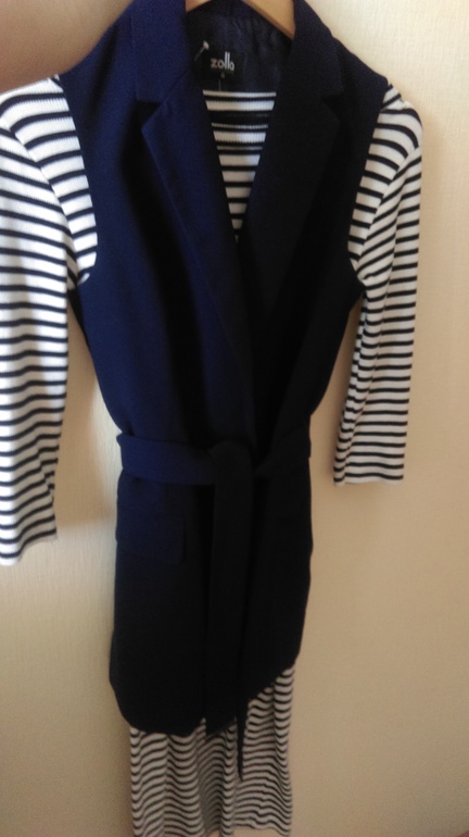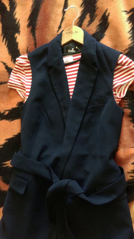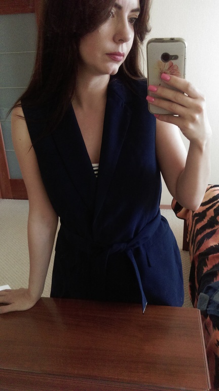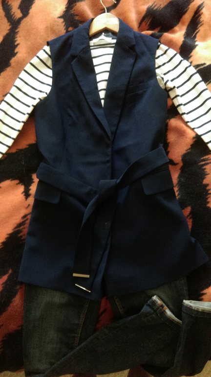 У меня темно-синий жилет, тонкий, весна-лето. Ношу с тельняшкой, с принтованными брюками и кучей цветов топами.