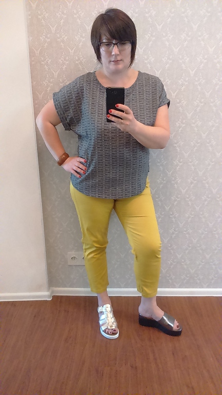 Первое совсем не ваше, полосатое платье мешковато очень, если только джинсовкой уравновесить его. Брюки нравятся прошлогодние. У блузки нравится фасон.