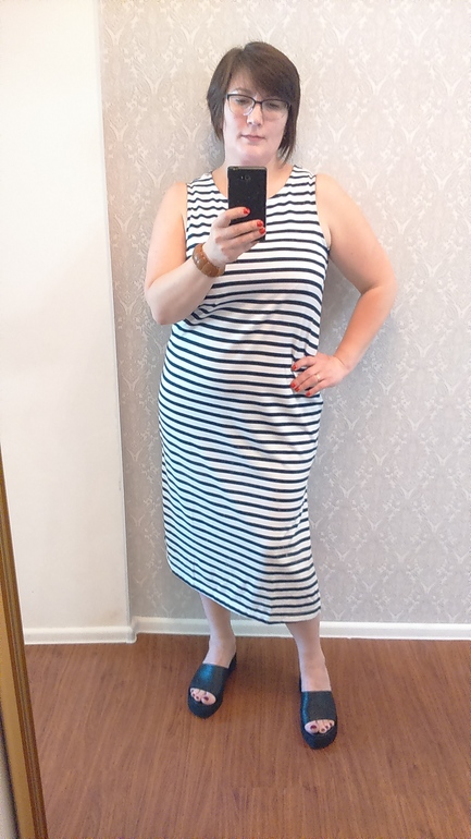 А платье в полоску где покупали? Я бы к нему поясок яркий повязала, тоненький