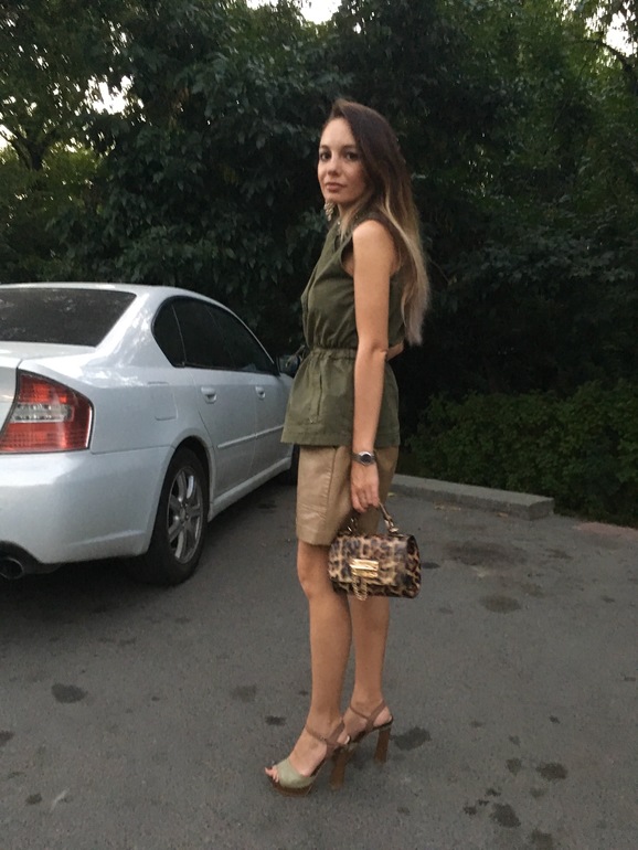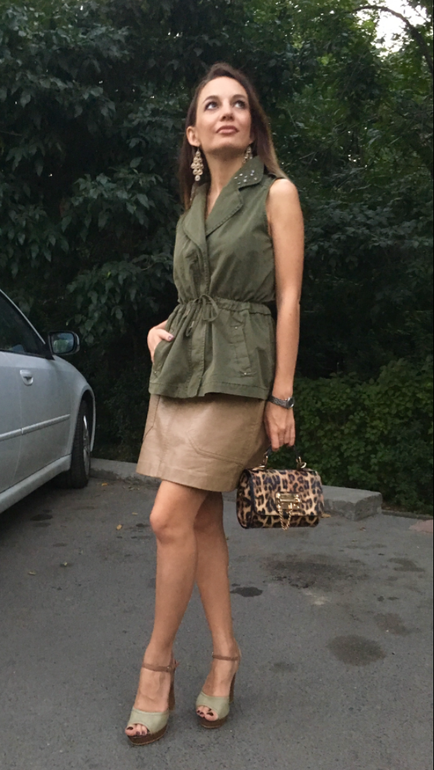 Этот жилет в Остине покупала довольно давно, в офисе летом был незаменим. С брючками песочного цвета и лодочками было идеально ) Весь мой декрет ждал своего часа. Дождался. Примерила его с юбкой под кожу из страдивариуса (вечером не жарко), добавила босоножки фисташкового цвета на устойчивом 12 см каблуке и свою леопардовую сумку)) Очень понравилось 🐆