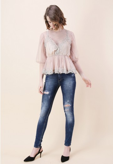 Бежевый топ с корсетом (голосовала) и голубое платье.