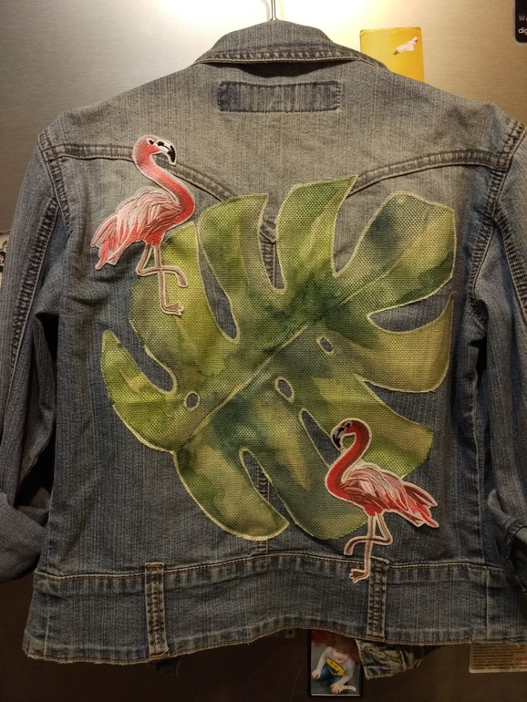 Фламинго заказывались на али с прицелом на платье в клетку виши, но погода не располагает, лучше уж курточку. Монстера - интерьерный чехол на подушку, тоже али. Работы на полчаса. Фламинго можно было приклеить намертво утюгом, но кто его знает, какой принт следующий в моде.