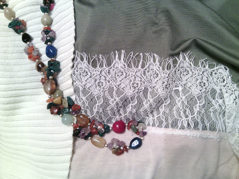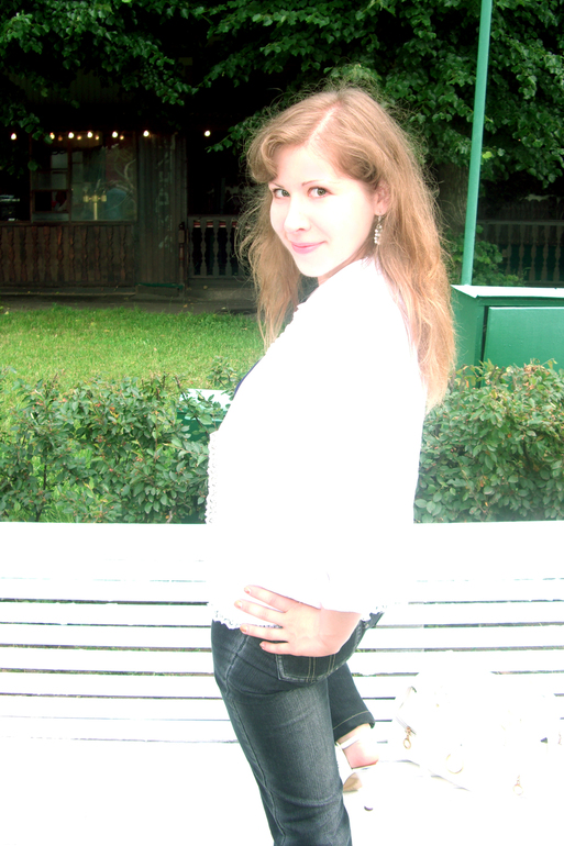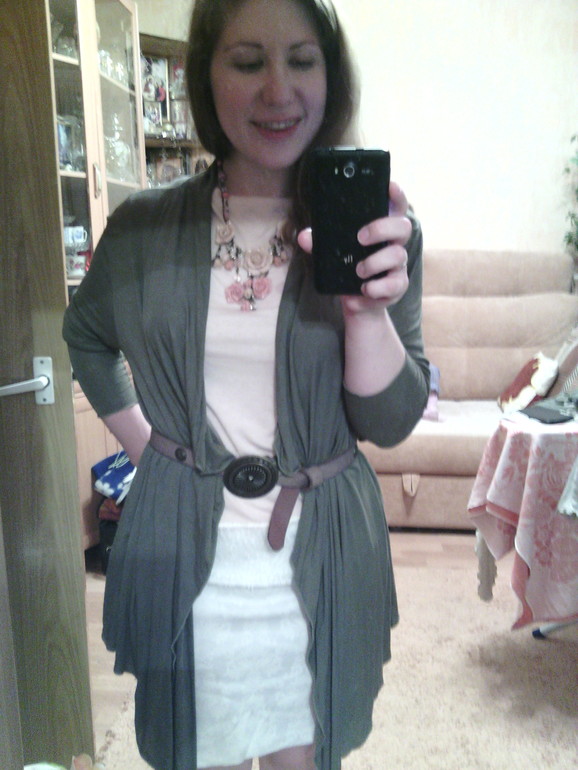 Остальные совсем не айс. Уберите из гардероба все кардиганы "с хвостами". Они полнят и убавляют итак маленький рост. О многослойности тоже лучше забыть. Халат в мелкий цветочек носите только дома, когда убираетесь. Белую юбку с шитьем надо обрезать, чтоб она была над коленом - длина не ваша, укорачивает ноги. При вашем росте и типаже массивное колье ну никак нельзя, причем оно вообще "провисает" и не сочетается с другими вещами. Извините, что так резко, но когда я вижу такие прекрасные исходные данные и совсем неподходящие вещи, молчать не могу :(