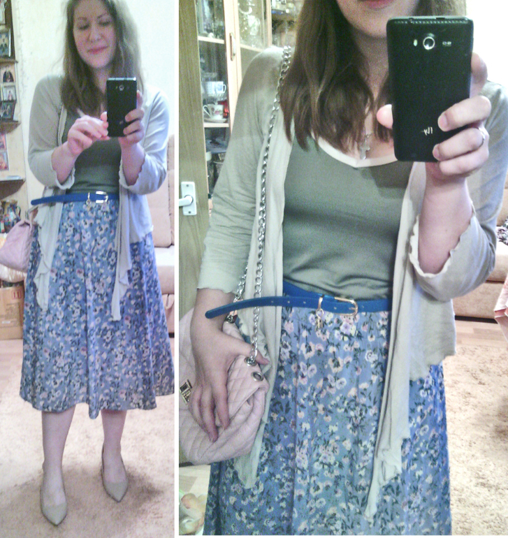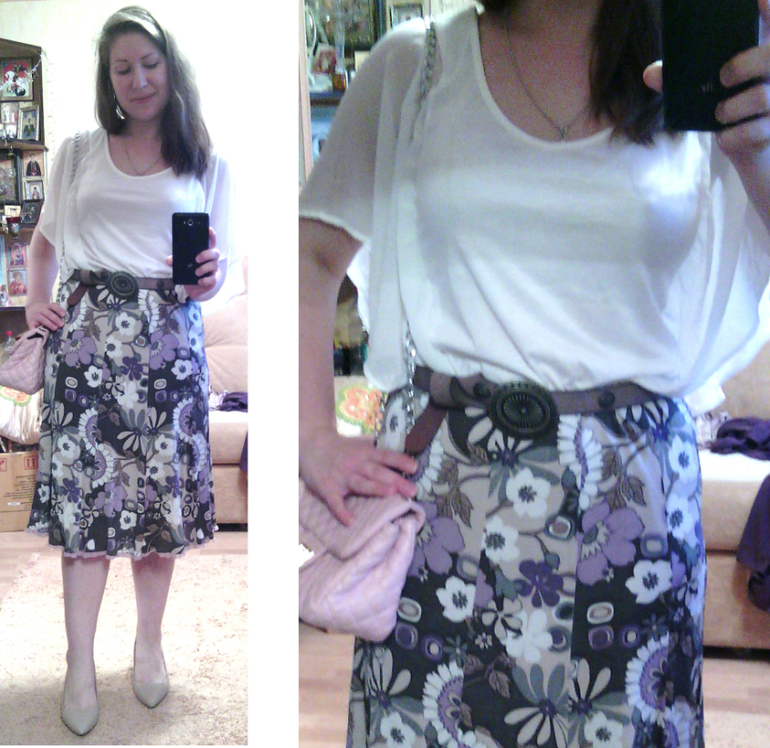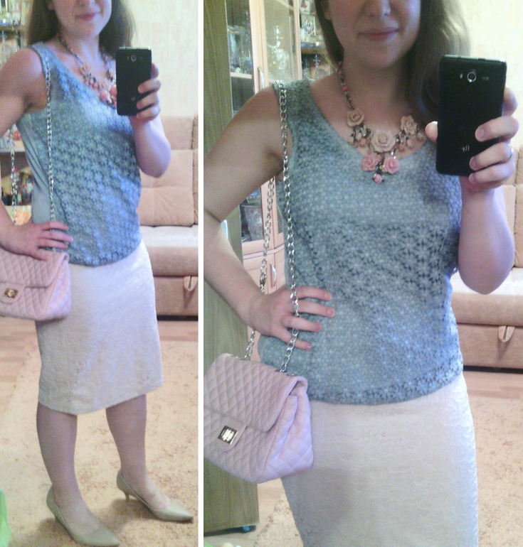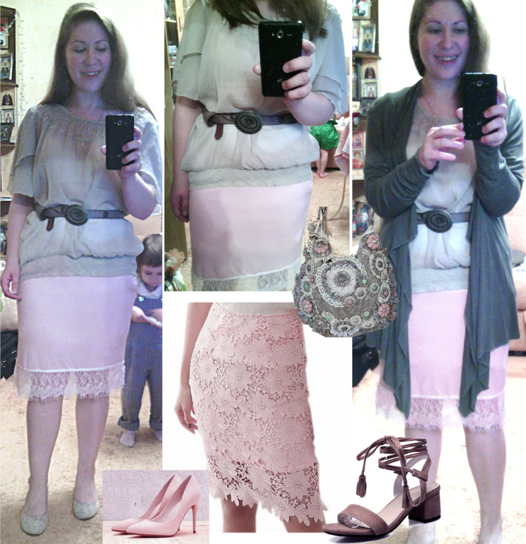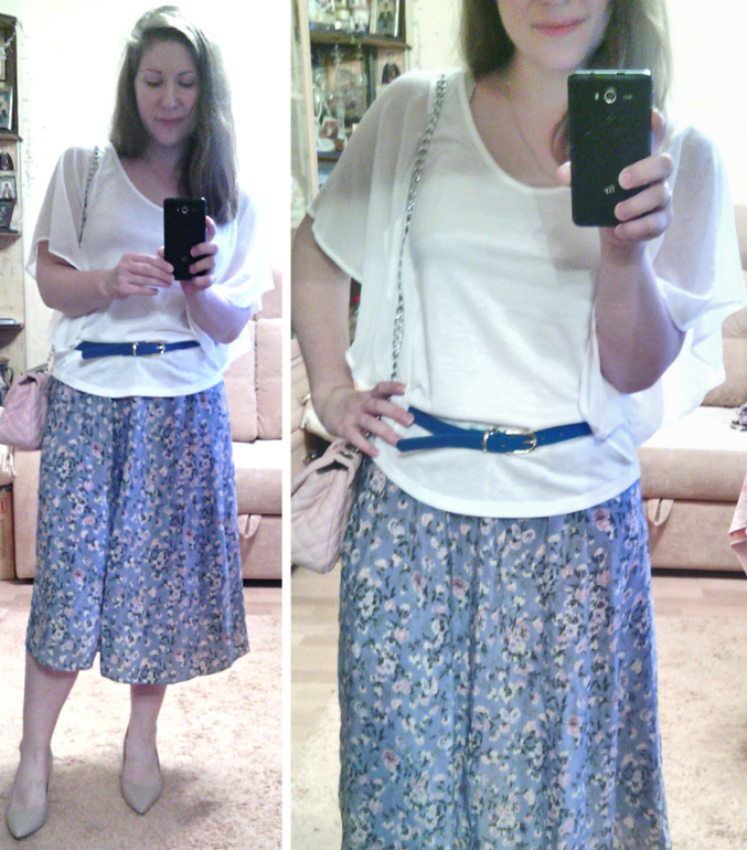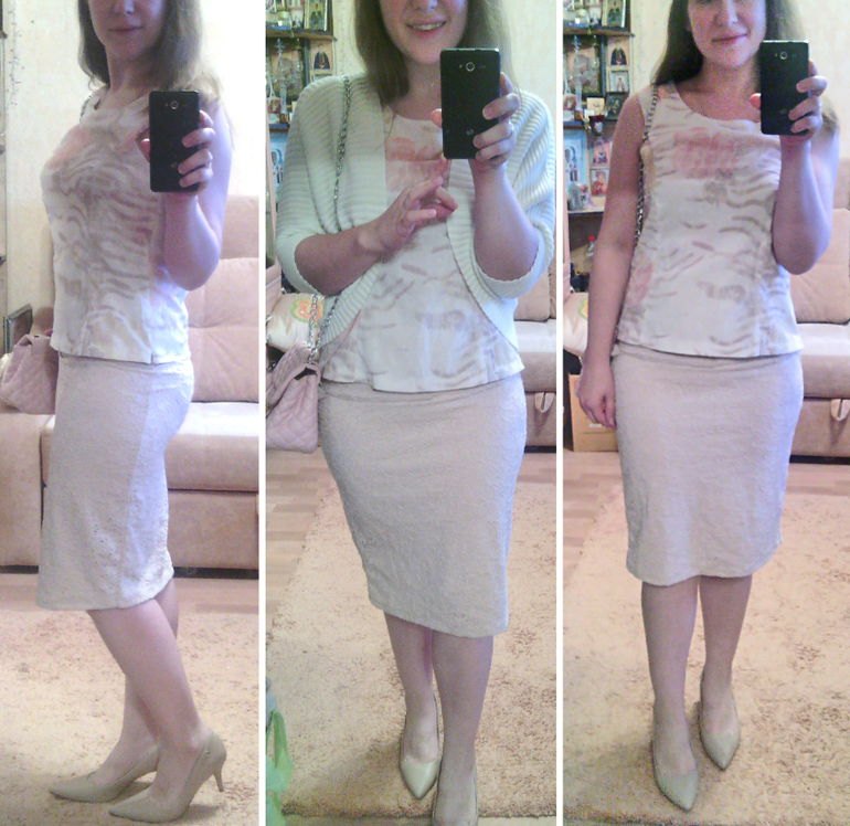 Тут юбка провальная, в отличие от той что идет на следующих фото, ну и блузка прибавила обьема не нужного и юбка, на добивание грубый ремень! Как итог барышня непонятного возраста и размером плюс сайз