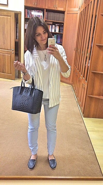 отличный образ!еще интересно посмотреть на твои новые брючки в полоску)у тебя уже челка отросла?)
