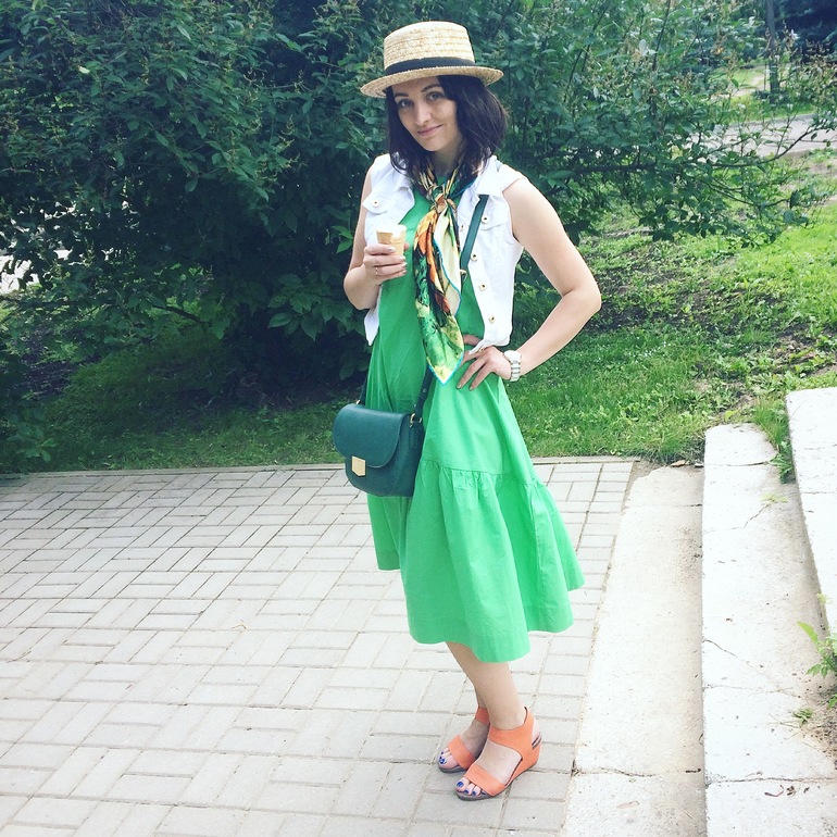 Ой, что-то много всего накрутили... И шляпа и жилет, платок, оранжевые босоножки, всё сразу успеть поносить за один теплый день? Вот честно, ту мач. Сарафан и шляпка и вы красотка.