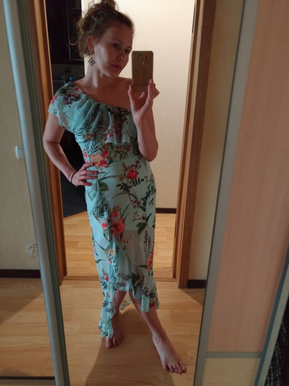 Правильно написали ниже,много рюш,было бы интереснее если бы низ был чуть расклешенный и все.+подъюбник просвечивает.тут прям талия увеличилась сразу,фигура изменилась..