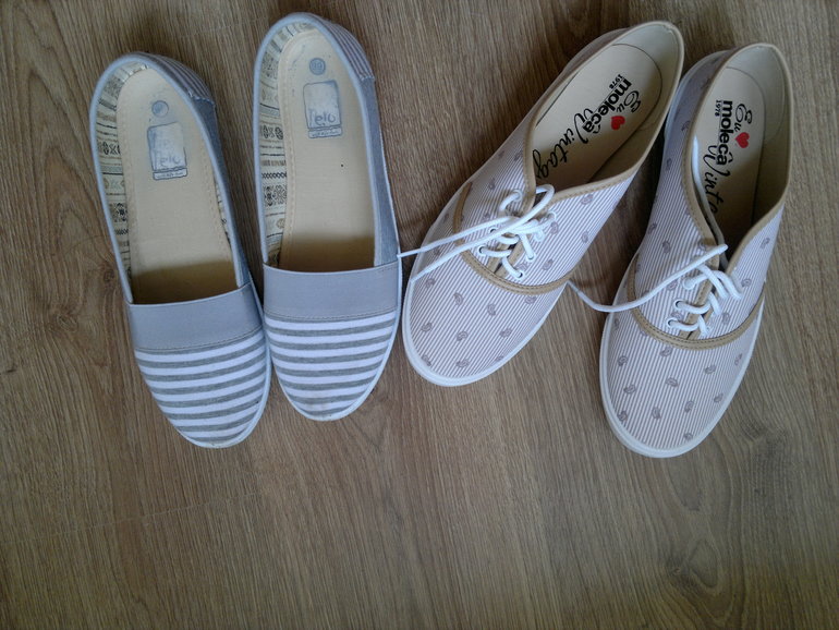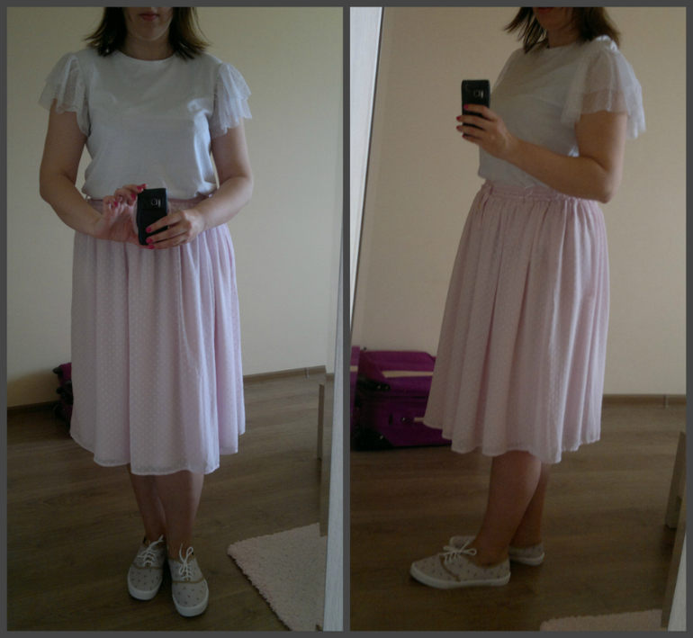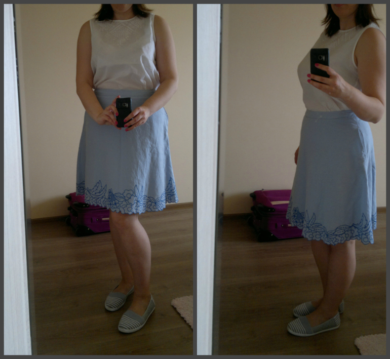 Не то чтобы юбки меня особо полнили, я просто полненькая ))) Теоретически сдать могу, но честно говоря не хочется. Розовая мне очень понравилась, хотя стараюсь такие не носить, длина - закрывает колено. Голубая - именно такую искала на замену старой. Кеды никогда не носила, но надо же когда-то начинать )) Первые бело-серые, вторые бежевые в реале коричневая окантовка более яркая. Из обуви есть еще бело-серебристые босоножки.
