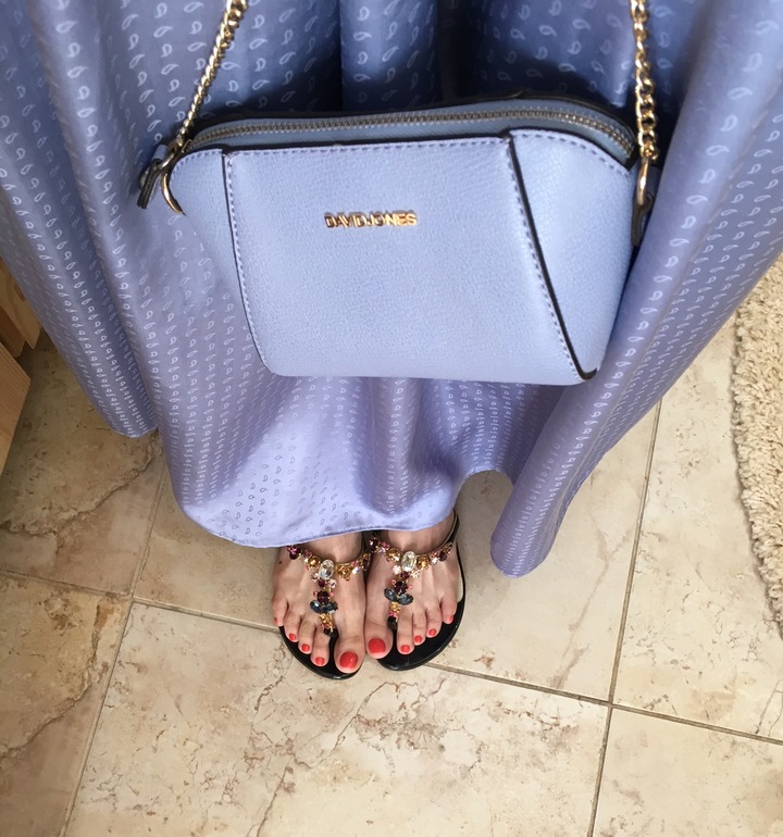 Добавила все украшения в том же цвете, топазы, сумку, украшение- подвеску и свои неудобные, но такие красивые босоножки)