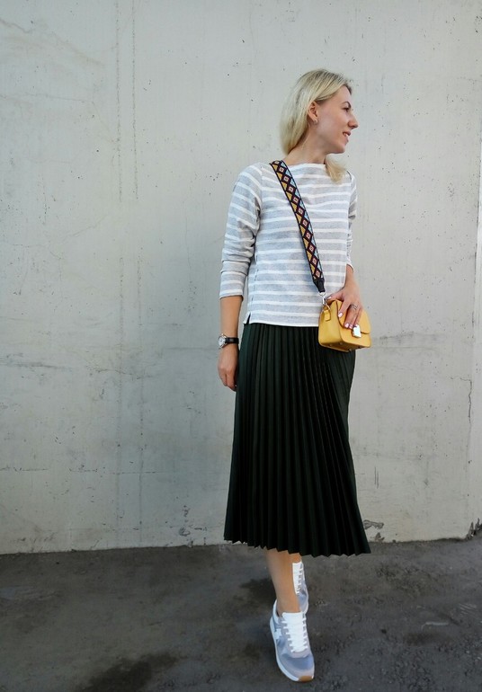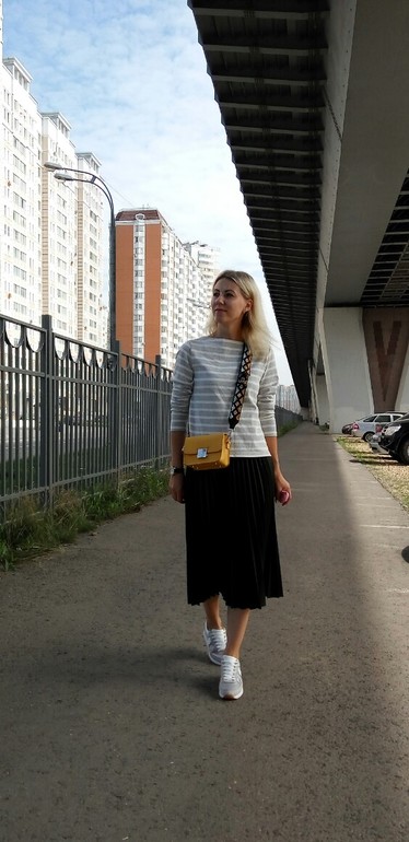 Юбка сидит на вас отлично - длина, цвет, фактура, НО вот с этими спортивными кроссовками смотрится нелепо, как привет из 80-х или 90-х, когда носили кроссовки с юбками, лосинами. Возможно вам нужны аккуратные кеды к этой юбке, если так хочется полуспортивный стиль, но только не эти грубые, огромные кроссовки, которым место в зале или на природе.