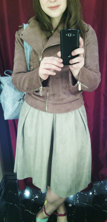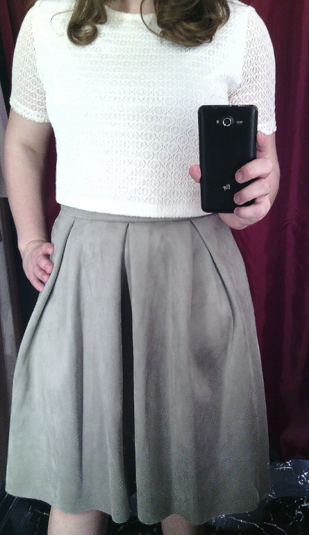 Юбка тоже "под замшу" . Юбка предполагает более утонченные бедра, нежели мои, поэтому складки топорщатся "гитарообразно". Хотя сама юбка очень классная. Может еще вернусь за ней и застрочу просто складки по бедрам..