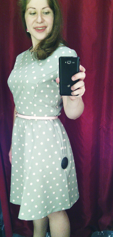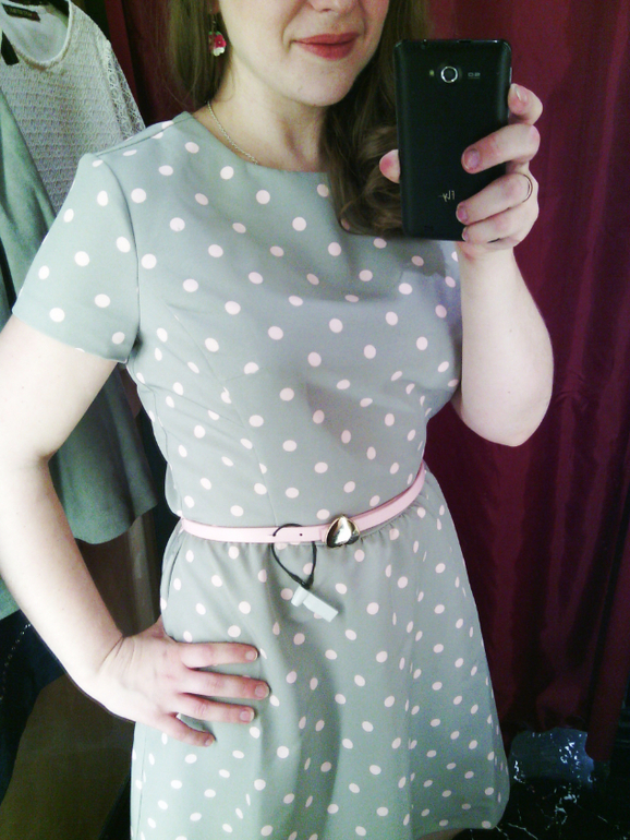 Платье - серое в розовый горошек. Милое. Но, че-то не то))) Розовое тоже непонятное. Внизу драппировка интересная, но верх не понравился. И оттенок розового не мой - "теплый".
