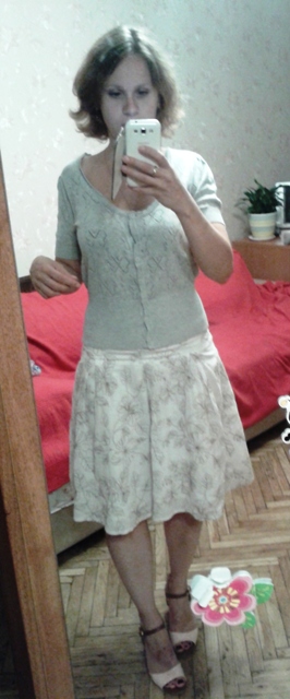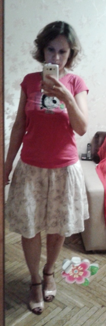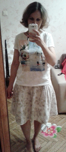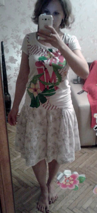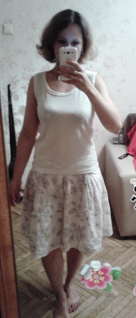Верх светлый однотонный, майка понравилась больше всего. Если она сидит низко на бедрах не заправляйте верх в юбку.