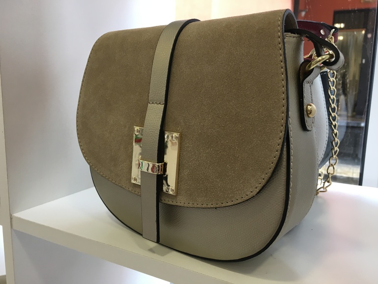 Приглянулась тут мне сумочка: цвет и форма понравились, кажется универсальный цвет. Кожа и замша натуральные. Цена на рубли 3500.