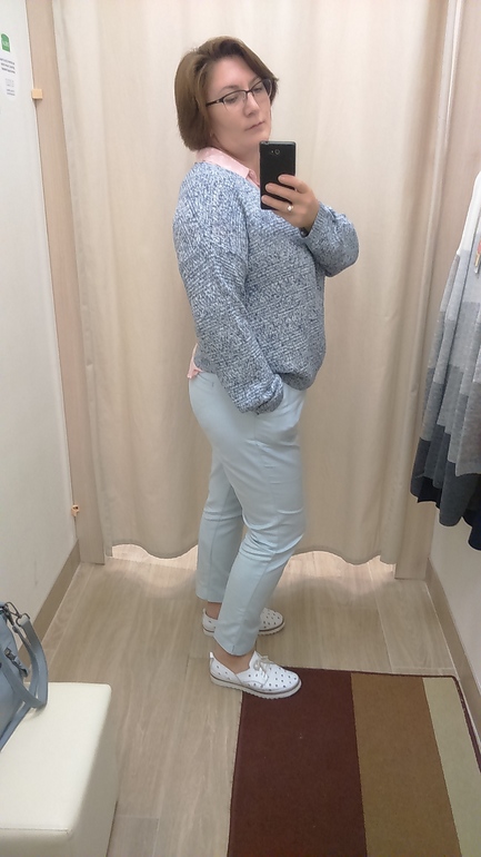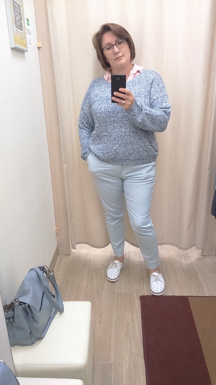 Синий мне очень нравится на Вас! Только кофточку нижнюю я бы длиннее надела