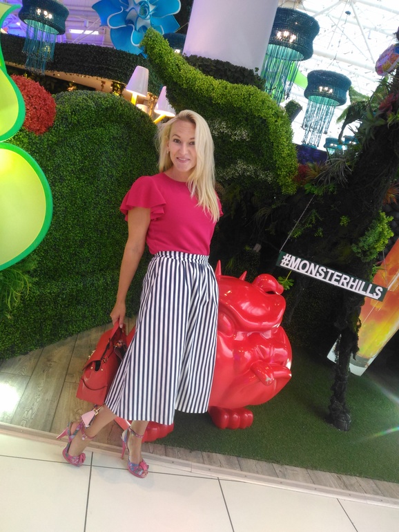 Ну и покажусь как гуляла по тц сегодня, опять юбка полосатая, только босоножки другие, нашла из старых запасов, а там принт даже с цветом сумки совпал