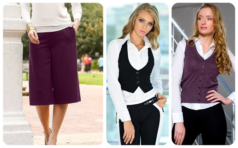 Внесу свое скромное предложение) Может быть что-то типа юбки-брюк плюс жилет и рубашка? Возможно, рубашка - непрактично... Тогда трикотажная блуза?