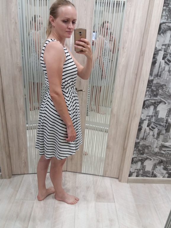 Я бы уже не стала, так сказать, нашла к чему придраться. Первое впечатление, что ткань животом натянулась, что рисунок исказился. Хотя живота нет. Может выбежать за хлебом или вечером с ребенком погулять.