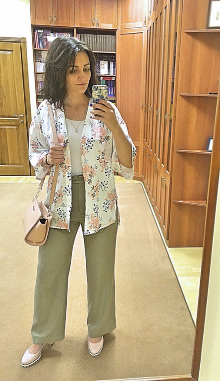 Купила себе широкие струящиеся штаны цвета хаки и нежнейшего материала кимоно (написано - синтетика, но она такая мягкая, как шелк...)