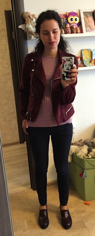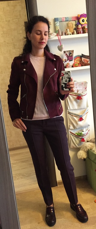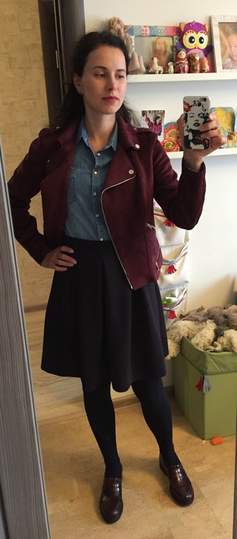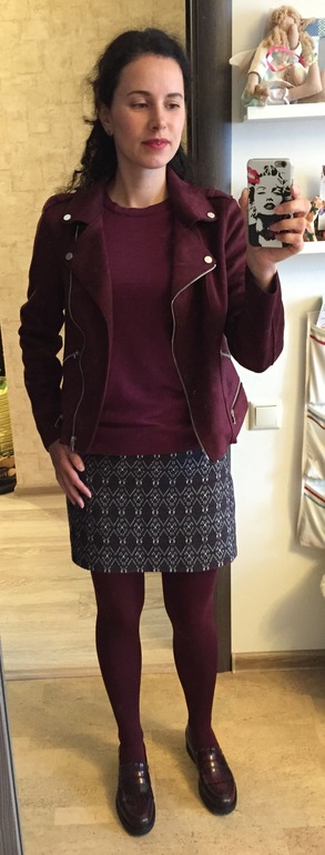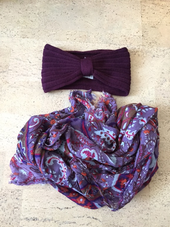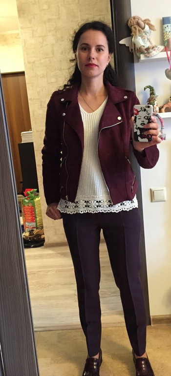 Купила из нового: голубую рубашку, голубой свитер, бордовые брюки (100% шерсть), бордовую косуху, повязку на голову, теплый шарф