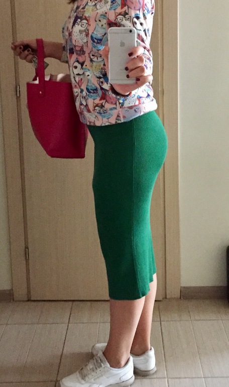спасибо) мне такие юбки можно носить только со свободным верхом. пузо и бока предательски обтянуты))