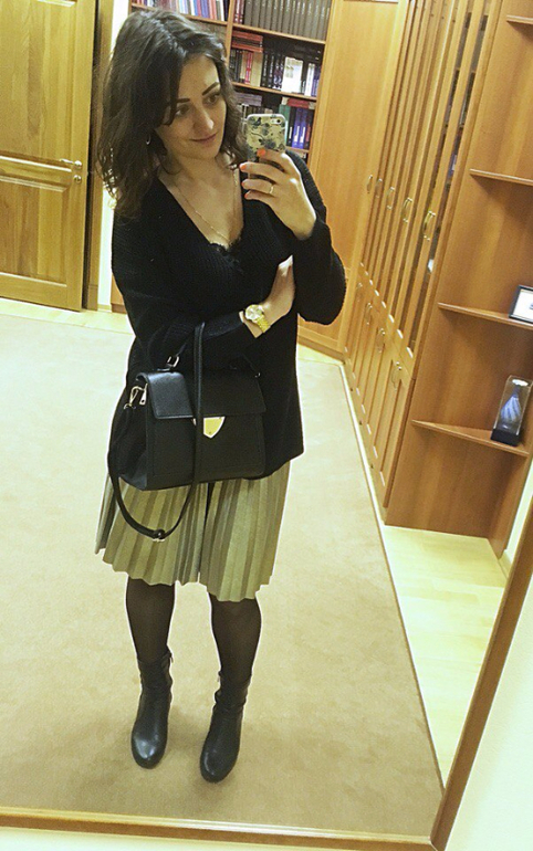 Вот ближе. Так как вырез слишком глубокий для работы и моей начальницы, под свитер я надела топ с кружевом, купленный в НМ специально для таких случаев.