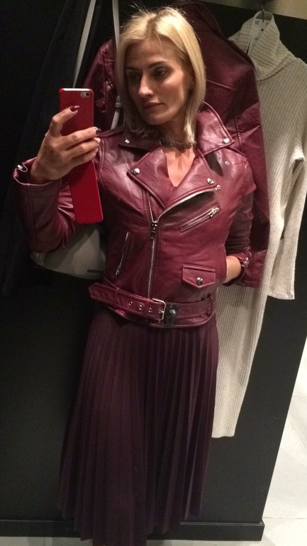 ПримерочнаяА купилось вон чего, по наводке Насти Сахарок , захотелось мне примерить косуху желтую, в итоге купилась косуха цвета гранат))) ну и юбочка плиссе))) цвета сочной свеклы😂