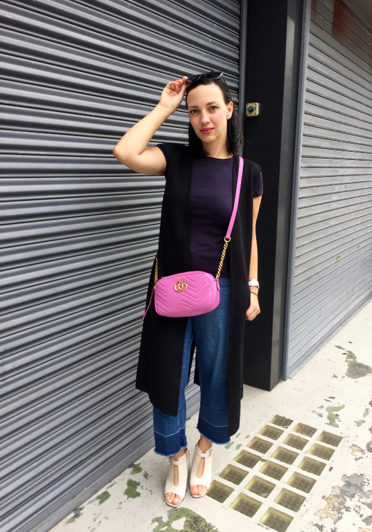 С жилетом ооочень! Наверное, потому что там стройней всего, и цвет сумки здоровский.