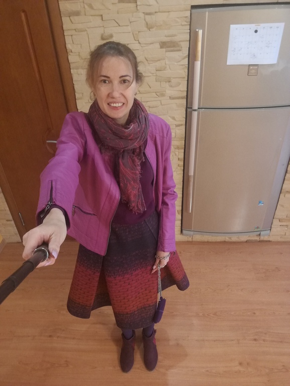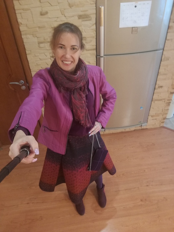 Очень ярко и красиво! Вам идет! Единственное из-за поднятой руки непонятно как куртка сидит, кажется что велика немного.