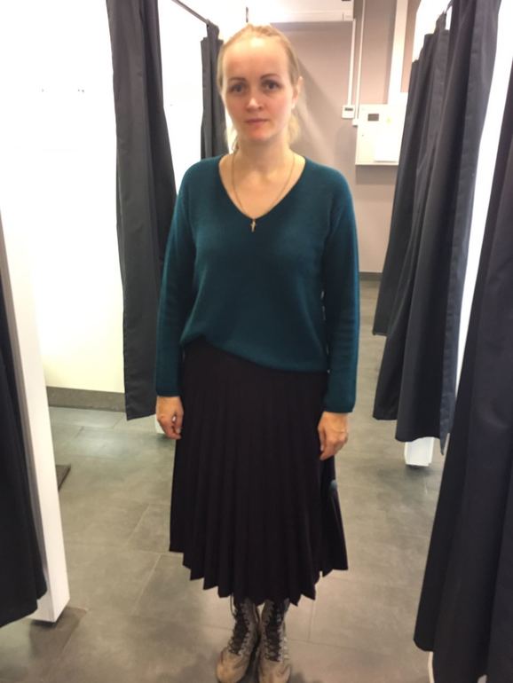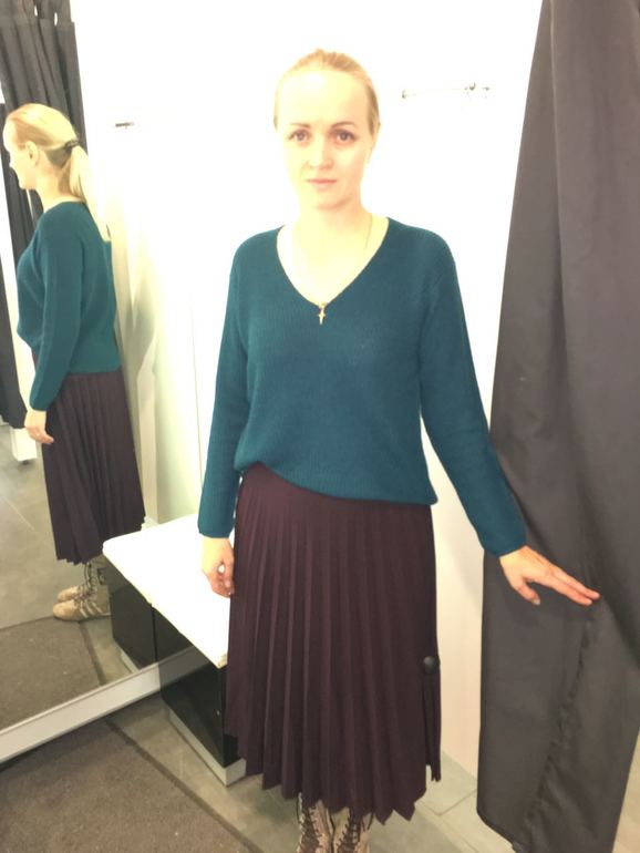 Вам не идут такие тёмные цвета, Вы в них старше на жизнь, хотя юбка по фасону Вам отлично.