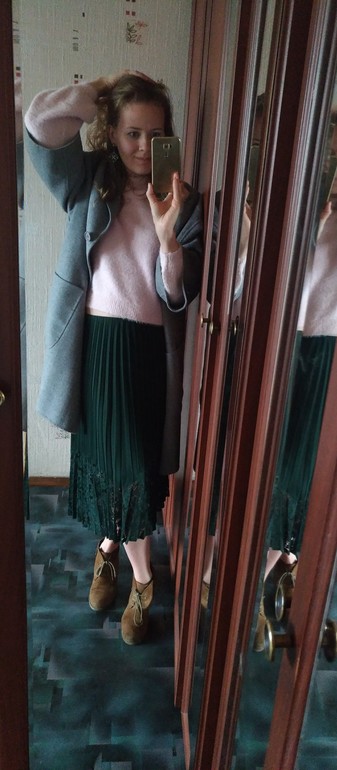 Мне очень понравилось пальто!очень стильное и современное!я когда фотку увидела уж прям порадовалась что вы такое что то модненькое урвали!а в комментах почему то все раскритиковали((не знаю может у меня со вкусом проблема...просто его надо не с этой юбкой показывать..а с джинсами например.юбка не понравилась совсем,а свитерок хороший!но если планируете носит вместе я бы попробовала бежево розовые кроссовки!