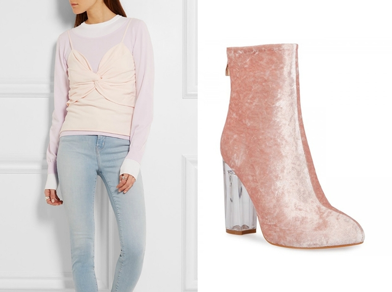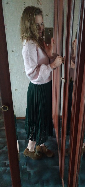 И купила изумрудную юбку и бледно-розовый свитер. Очень нравится сочетание. Вопрос, какую обувь и колготки?
