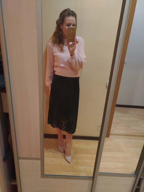 По поводу юбки и свитера - сами вещи красивые, но то ли ты опять встала криво, то ли фасоны не твои. К каким пропорциям в одежде надо стремиться? - к песочным часам. Выраженные плечи-тонкая талия-выраженные бедра. В этой юбке бедер нет! Плечи вижу, талию опять не вижу) поэтому фасон солнце тебе подойдет больше) делай талию, открывай ноги)