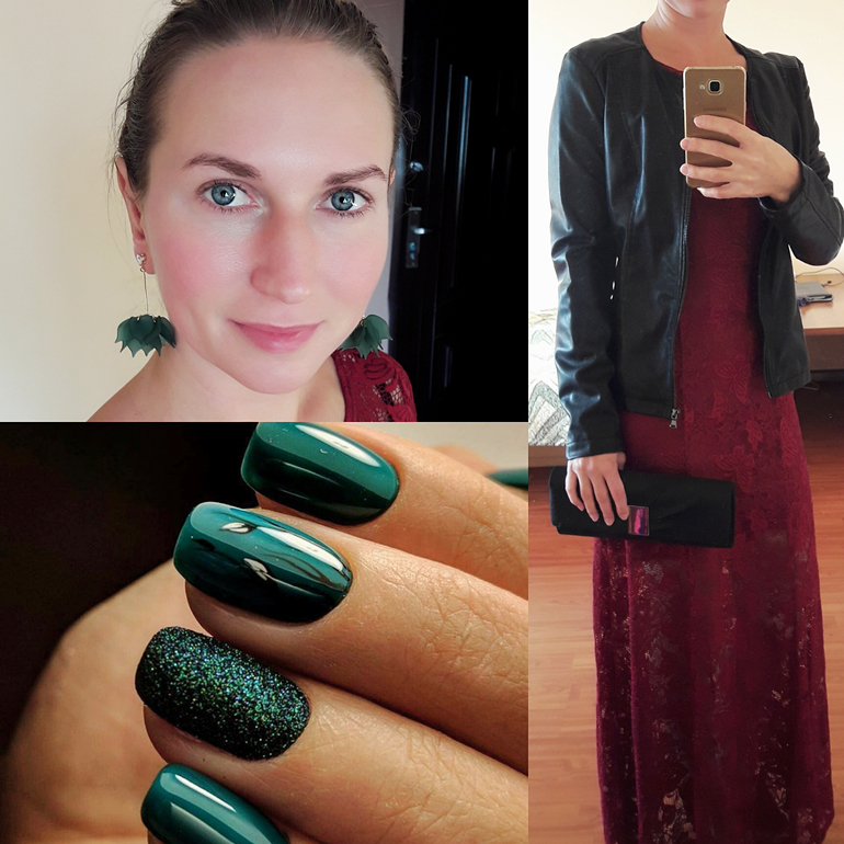 Я лет 8 назад была почти в таком же сочетании, только наоборот) Темно-изумрудное платье и бордовый глянцевый маник, только классический, без выделенного ногтя.