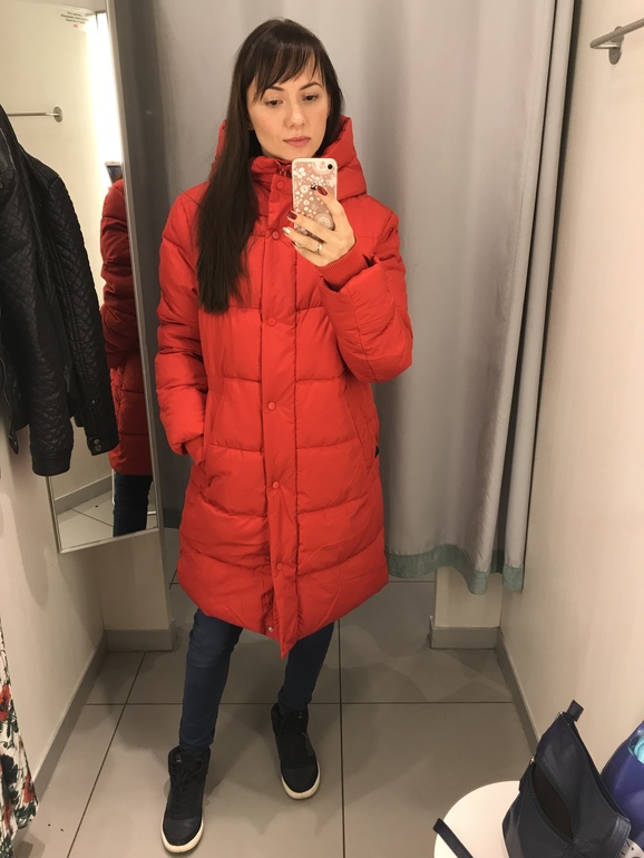 Пуховик больше, чем мне по идее надо, но из-за фасона вроде этого не видно.