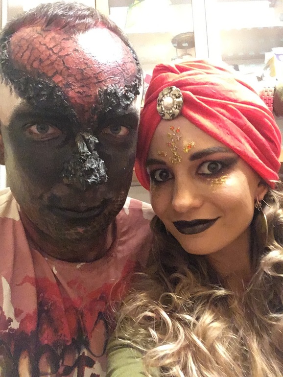 Также, муж попросил грим дракона. Я мучала его около двух часов... но качество красок оказалось ужасным в итоге идея не совсем удалась, так как через час танцев в клубе все потекло 😅 Жесть, думаю надо было на лбе остановится и линзы купить...краски подвели. Однако, я получила огромное удовольствие, полет фантазии ))