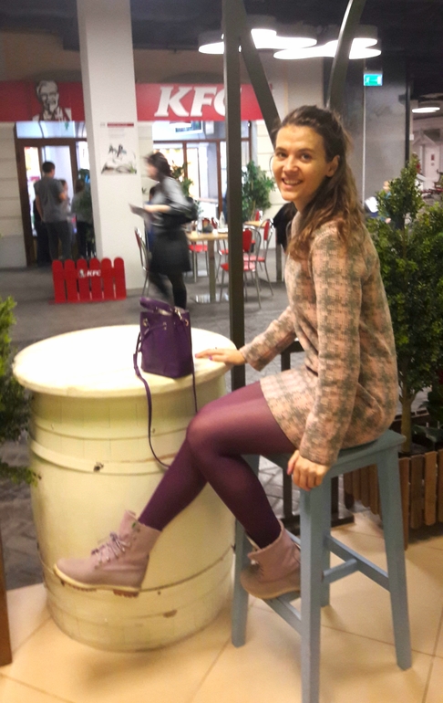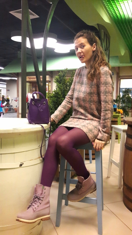 У меня платье есть похожего цвета, клетка там розово-голубая, глядя на вас, тоже захотелось с цветными колготками поэкспериментировать.