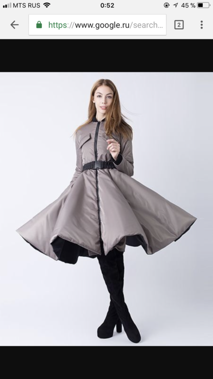 У моей подруги Одри такой, ей холодно даже в такую погоду, как вчера, ну либо термобелье надеть подниз, и еще кофту ... Видела пуховик на очень милой девушке с менее пышной юбкой, и она немного книзу сужалась, как балон, при этом довольно много в нем утеплителя судя по виду, капюшон с мехом густым, мне оч понравился, в таком думаю не холодно. И все не покидает чувство, что видела его у консо или науми, но не могу найти ))