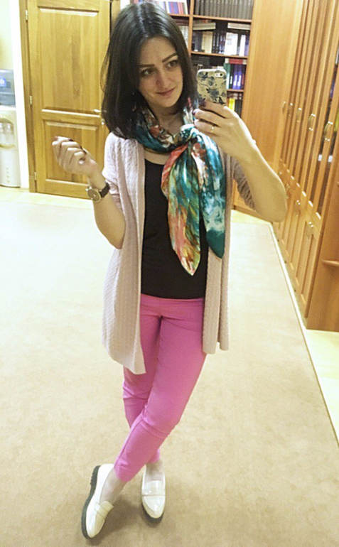 По мне - большеват, такой лучше под верхнюю одежду, а тут лучше было бы шейную косыночку. Слишком длинные концы остаются
