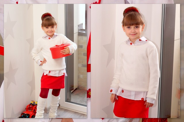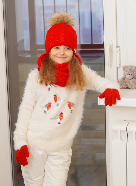 А еще я же нашла свитерок-пушистик в Акуле, который тоже удачно вписался в наш зимний комплект. Правда, на этом свитере не коты, не цветочки и не ласточки, а снегири, но тоже из пайеток)