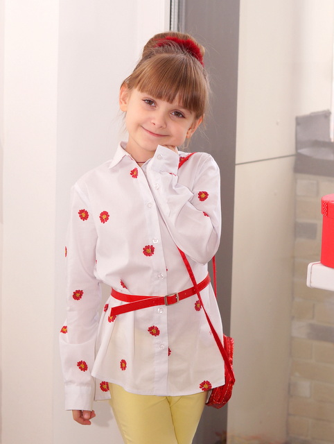 Но на этом дело не закончилось. Нам же жутко нашивки и аппликации понравились в Гулливере! Поэтому мы прикупили из этой же коллекции блузочку с контрастными цветочками.
