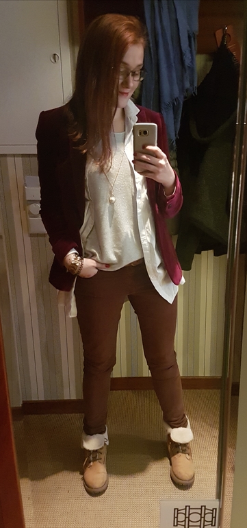 Ой как мне все нраицца!! И пинжак этот малиновый! И рубашка на джемпер! Многослойность рулит! )))