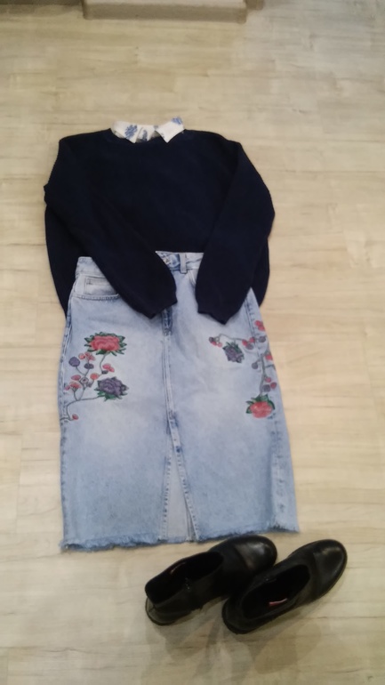 Рубашка Benetton, свитер Levis, юбка Mango, осенние ботинки Tamaris