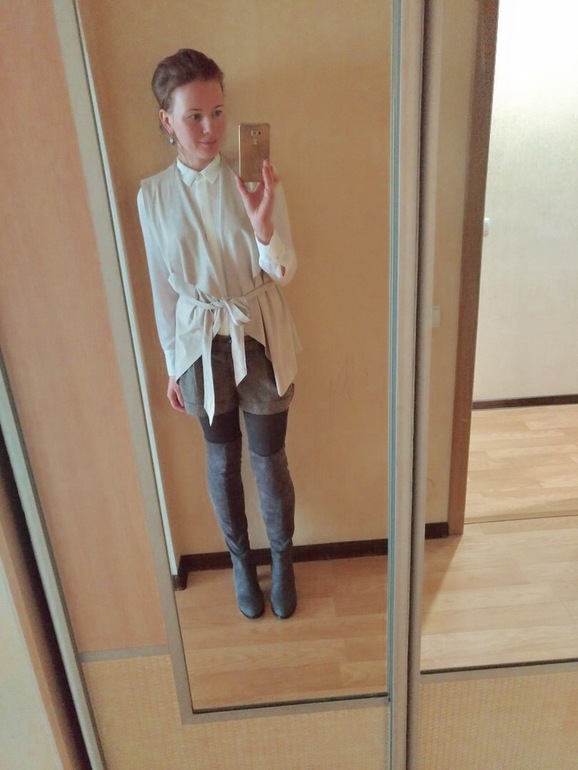 и еще образ с ботфортами. Жилет под замшу, рубашка, шорты, матовые серые колготки и ботфорты.