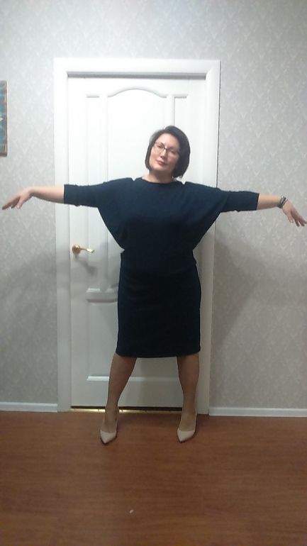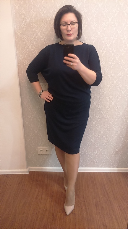 Купила на корпоратив темно-синее однотонное платье и нюдовые туфли.