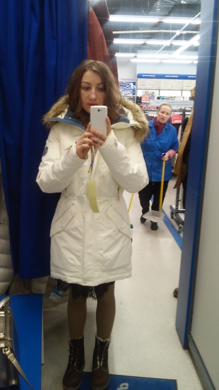 Это я в процессе примерки (обратите внимание на женщину за спиной, которая комментирует, как правильно носить парки 😁